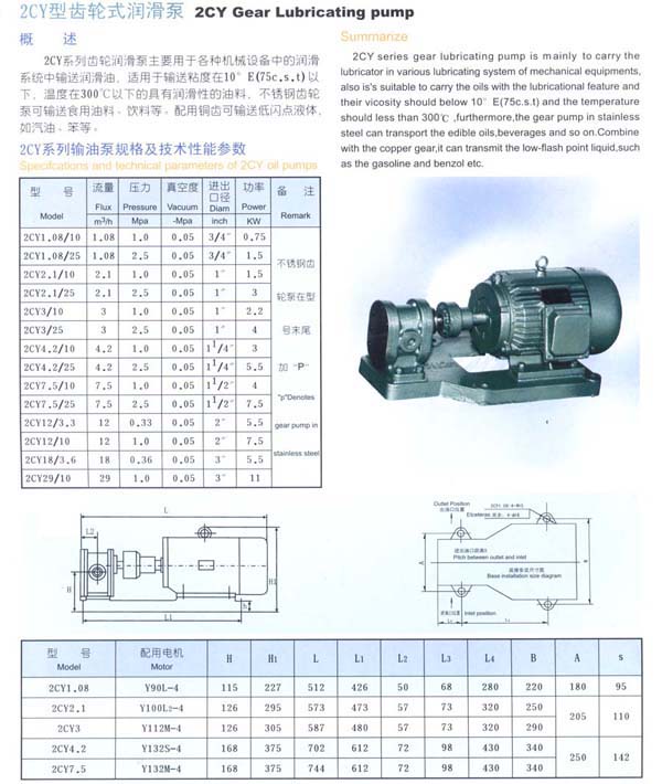 2CY系列齒輪潤(rùn)滑泵主要用于各種機(jī)械設(shè)備中的潤(rùn)滑系統(tǒng)中輸送潤(rùn)滑油,適用于輔送粘度在10°E(75c,s.t)以下,溫度在300℃以下的具有潤(rùn)滑性的油料,不銹鋼齒輪泵可輸送食用油料、飲料等:配用銅齒可輸送低閃點(diǎn)液體如汽油、笨等。